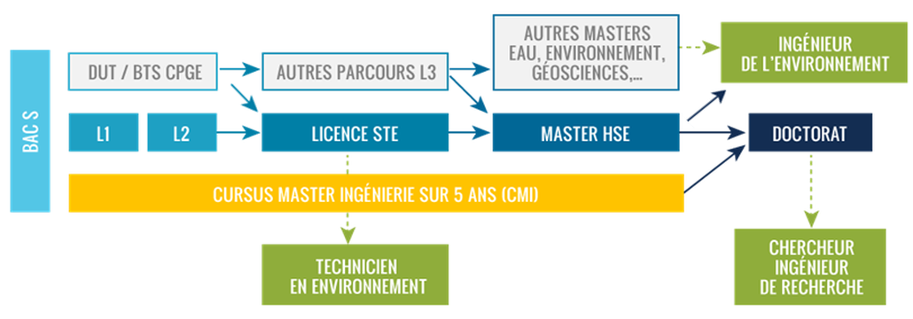 Le Master HSE forme des hydrogéologues capables d’évoluer et d’agir dans un contexte de changement global en relation, avec le cadre paysager et le sol. Le Master Hydrogéologie Sol et Environnement est indifférencié Recherche et Professionnel.