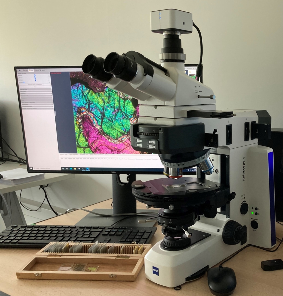 Poste de pétrographie microscopique : microscope pétrographique binoculaire Zeiss Axioscope 5 pour observations pétrographiques et minéralogiques des échantillons de roches. Instrument équipé de caméra numérique, compensateur de Berek, lentille de Bertrand, condensateurs optiques, polarisateurs permettent les observations épiscopiques et diascopiques de lames minces.