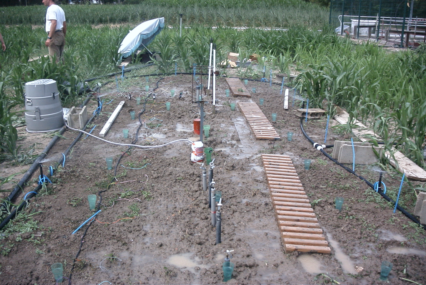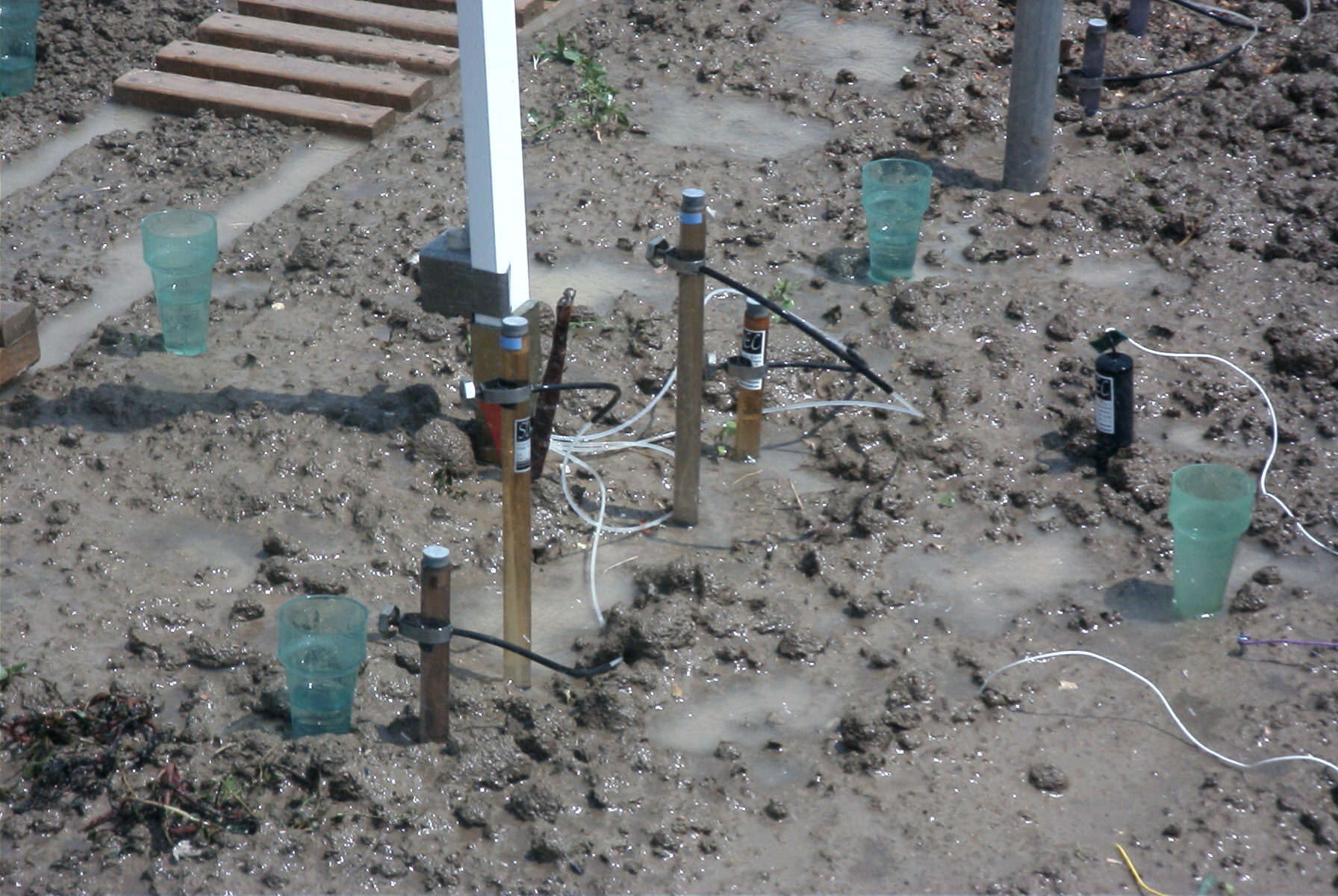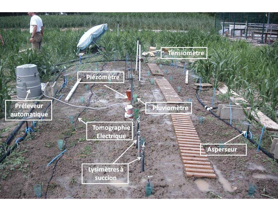 Détails des pluviomètres, tensiomètres à mercure et électrode (potentiel spontanée) pour l’étude de l’infiltration dans un sol agricole, sur le site St. Paul.