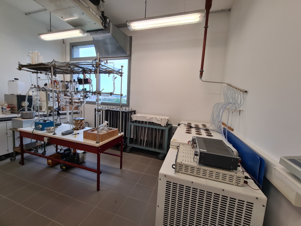 Au centre – droite de l’image : systeme de pré-enrichissement en tritium par éléctrolyse sur vide, deuxième étape de traitement des échantillons d’eau pour le dosage du tritium par scintillation liquide. .